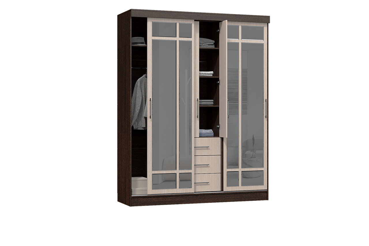 Лаконичный внешний вид и стильный дизайн шкафа-купе удачно сочетаются с практичностью и надежностью. Боковые зеркала зрительно уменьшают его объемные формы, придают ему невесомость.